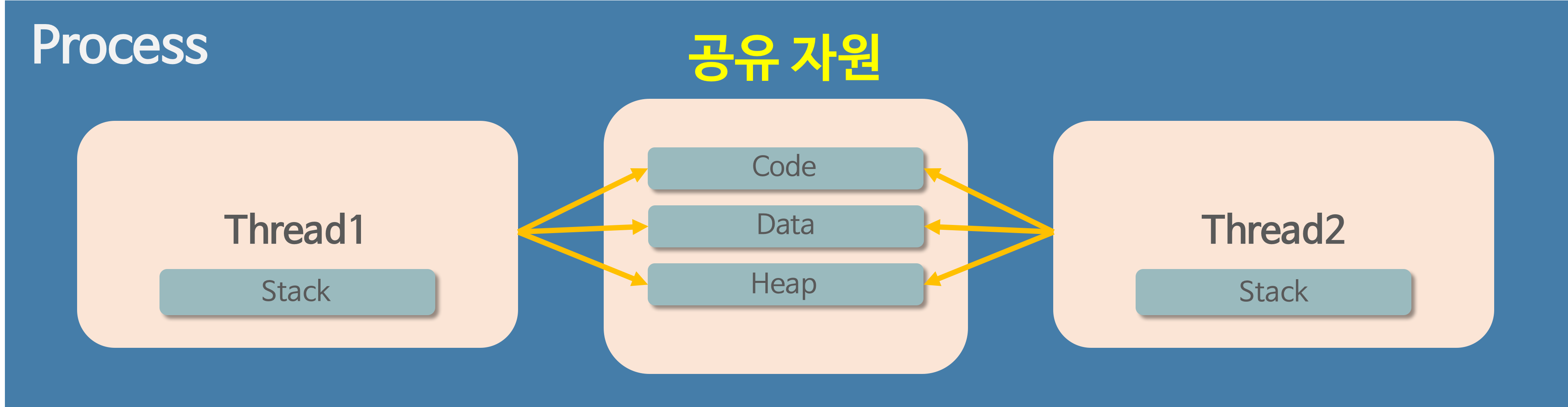 스레드는 사용 경험 향상에 있어 장점이 있을 뿐만 아니라. 컨텍스트 스위칭 시 오버헤드 감소에서도 장점이 있습니다. 스레드는 위처럼 Process의 Code, Data, Heap을 공유하고 Stack은 따로 갖고 있습니다. 코드의 호출 순서나 매개변수의 경우 공유할 필요가 없기 때문에 stack만 따로 갖는 것입니다. 따라서, 프로세스 단위로 컨텍스트 스위칭할 때는 Code, Data, Stack, Heap을 모두 바꿔야 하지만 스레드 단위 컨텍스트 스위칭의 경우 Code, Data, Heap을 공유하므로 오직 Stack만 바꾸면 됩니다. 그러므로 컨텍스트 스위칭 시 발생하는 오버헤드가 감소합니다.