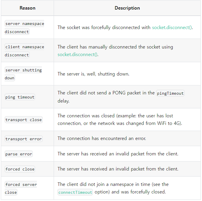 이 이벤트는 연결 해제 시 Socket 인스턴스에 의해 시작됩니다. reason 목록은 아래와 같습니다.