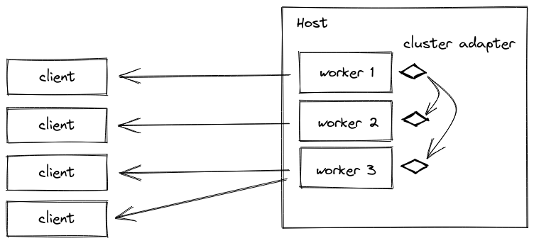 Cluster adapter를 사용하면 Node.js cluster 내에서 Socket.IO를 사용할 수 있습니다. 여러 클라이언트(e.g., io.to("room1").emit() 또는 socket.broadcast.emit())에게 전송되는 모든 패킷은 IPC 채널을 통해 다른 workers에게도 전송됩니다.