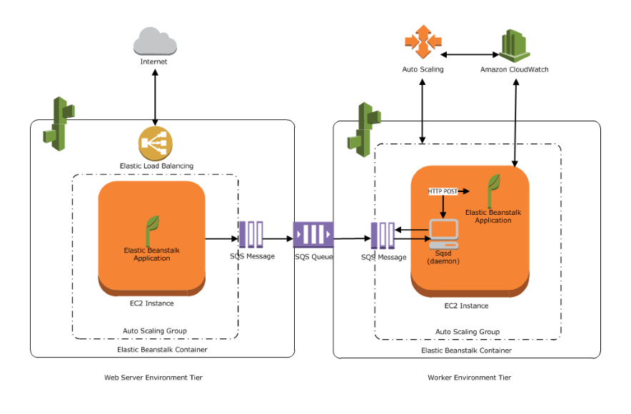 작업자 환경을 시작하면 Elastic Beanstalk가 Auto Scaling 그룹의 각 EC2 인스턴스에 선택한 프로그래밍 언어에 필요한 지원 파일과 데몬을 설치한다.