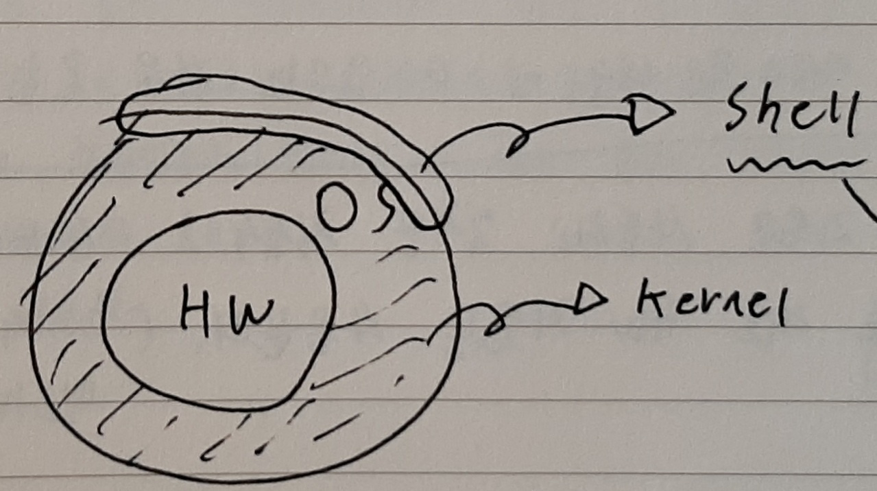 OS는 하드웨어를 제어/관리한다. 실질적으로 하드웨어를 제어/관리하는 부분을 kernel이라고 하며 사용자와 소통하는 바깥 부분을 shell(껍데기)이라 한다. 사용자는 shell이 제공하는 인터페이스를 통해 shell에게 요청을 전달하고 shell은 사용자의 요청을 해석하여 kernel로 넘겨주고 kernel은 넘겨받은 요청을 수행하는 형식으로 OS가 동작한다. 다시 말해 shell은 kernel과 사용자 간 다리 역할을 하는 하나의 interface이다. 예를 들어, 바로가기 아이콘을 더블 클릭하거나 bash shell과 같은 command interpreter를 사용하여 명령어를 입력하면 shell은 그러한 명령을 받아서 해석한 뒤 kernel에게 전달하고 kernel이 실제 HW를 실행하여 해당 프로그램이 실행되는 것이다. (User > shell > kernel) 만약 shell이 없었다면 더블 클릭으로 프로그램을 실행하는 것이 불가능하며 kernel과 직접 소통을 위해 기계어 수준의 명령을 직접 입력해야 할 것이다. 또, HW에 치명적인 실수를 방지할 수도 없을 것이다. 이를테면, shell은 인터페이스니까 사용자가 치명적인 명령을 내리면 경고를 하거나 해당 명령을 차단하는 등 방지 대책을 세울 수 있지만 kernel과 직접 소통하면 그런 거 없다. 이처럼 shell이라는 인터페이스를 제공하는 이유는 편의성과 보안 때문이다.