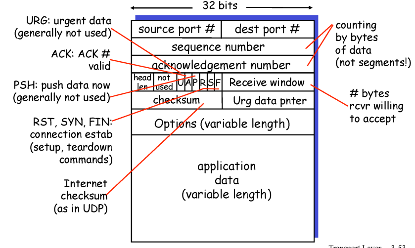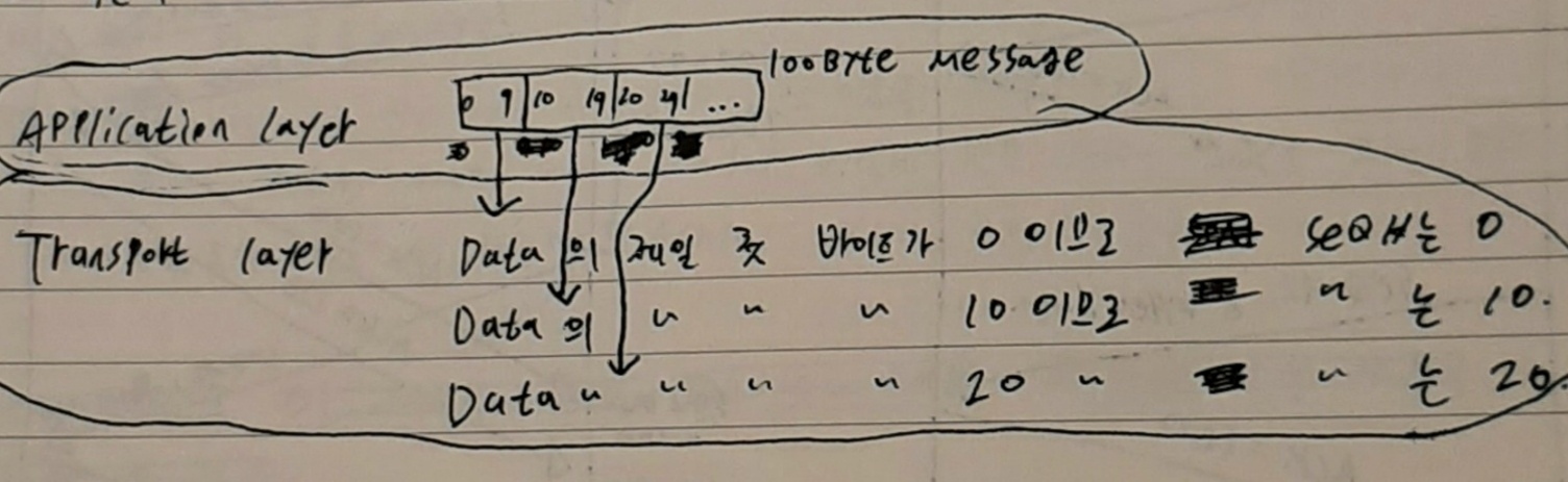 - TCP에서 sender가 segment header에 적는 seq#는 data 부분의 제일 첫 바이트의 순서 번호이다.