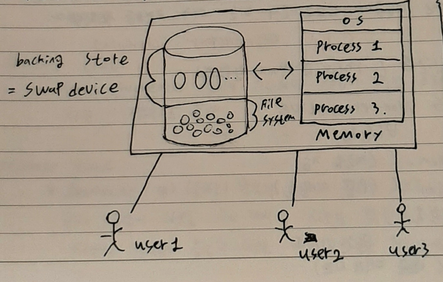 ** medium-term scheduler라는 것도 있다. 이것은 Swapping을 뜻하는데 swapping이란 다음과 같다. 아래 그림과 같이 하나의 서버에 세 명의 유저가 접속하여 각자의 프로세스를 메모리에 올린 경우를 생각해 보자. 이때 user2가 잠시 화장실을 간다면 메모리에 올려져 있는 process2는 그 시간 동안 굳이 메모리에 올라와 있을 필요가 없다. 이때 OS는 process2를 swap device(하드디스크 안에 일정 부분을 swap device로 사용하며 backing store라고도 부른다.)로 쫓아버린다. 이처럼 PCB를 통해 process를 감시하는 OS가 오랫동안 사용되지 않는 process를 발견하여 swap device로 쫓아버리는 작업을 swap out이라고 한다. 반대로 사용자가 돌아와 process를 사용할 때 다시 메모리에 올리는데 이런 작업은 swap in이라 한다. 이렇게 사용되지 않는 process를 쫓아내고 다시 들이고 하는 작업을 통 들어 swapping이라 한다. OS는 swap out 된 프로세스를 다시 swap in 할 때 원래 본인의 자리였던 곳에 다른 프로세스가 들어서 있을 수 있으니 어디에 올릴지 계산을 해야 한다.