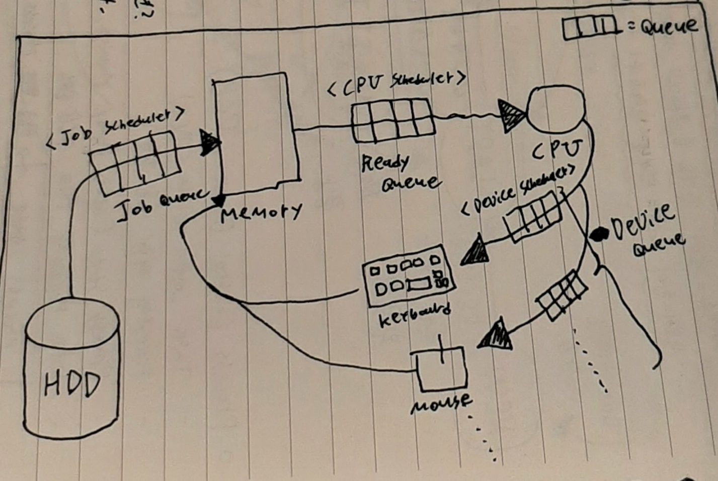 queue는 대기 줄을 뜻한다. 서울에서 대구로 가는 사람이 한 명만 있다면 문제없이 갈 것이다. 하지만 서울에서 대구로 가는 사람이 백억 명이라면 분명히 어떤 방식으로든 길게 줄을 서야 할 것이다. 컴퓨터 속 다양한 길목에도 이러한 queue(대기 줄)가 있다. 컴퓨터의 queue는 크게 세 가지 Job queue, Ready queue, Device queue가 있으며 이는 아래 그림과 같다. 참고로 scheduler란 queue에 있는 녀석들 중 어느 것을 먼저 내보낼지에 관련된 일을 하는 녀석들이다. 먼저 온 것을 먼저 나가게 해 줄 수도 있도 또 다른 로직이 있을 수도 있다.