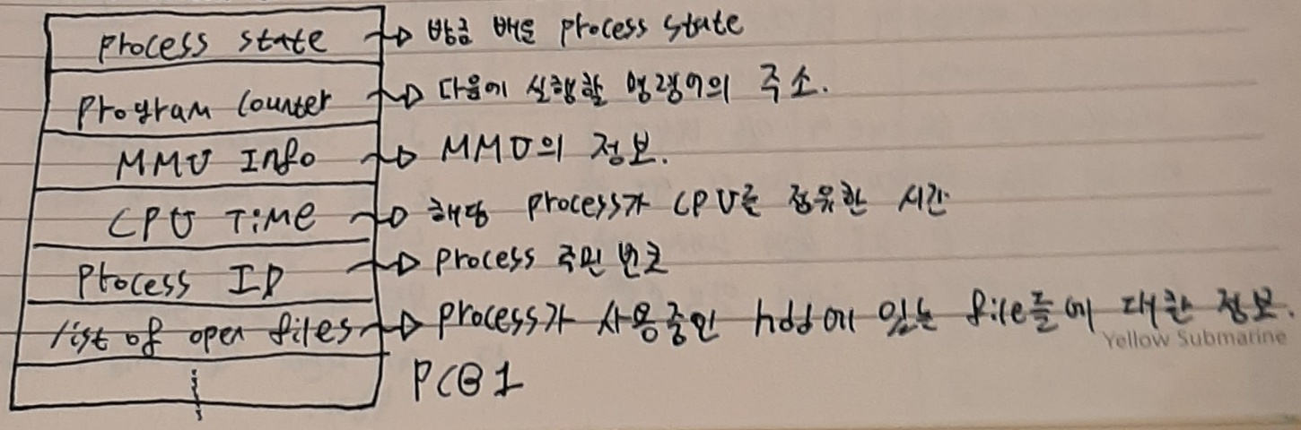 프로세스에 대한 모든 정보, process state(new, ready, running waiting, terminated), PC(program counter), registers, MMU info, process ID, ... 등을 담고 있는 블록이다. 1개의 프로세스당 1개의 PCB가 존재한다.