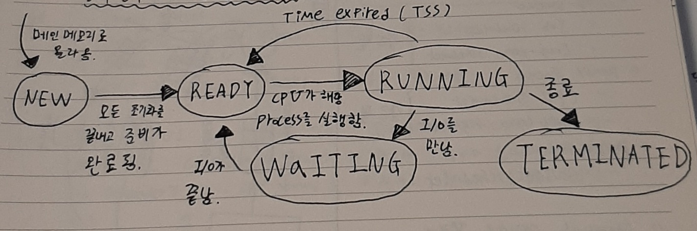프로세스는 메모리에 올라가 실행 중인 프로그램을 뜻한다. 프로그램과 프로세스의 차이는 메모리에서 실행 중인가 hdd에서 가만히 있는 중인가의 차이다. hdd에 있는 프로그램이 메모리에 올라가서 실행되면 그것을 프로세스라고 불린다. 프로세스는 task, job이라고도 불리며 text(code) + data + stack 등을 갖는다. 프로세스는 new, ready, running waiting, terminated의 상태를 갖는다. 아래 그림을 참고하자.
