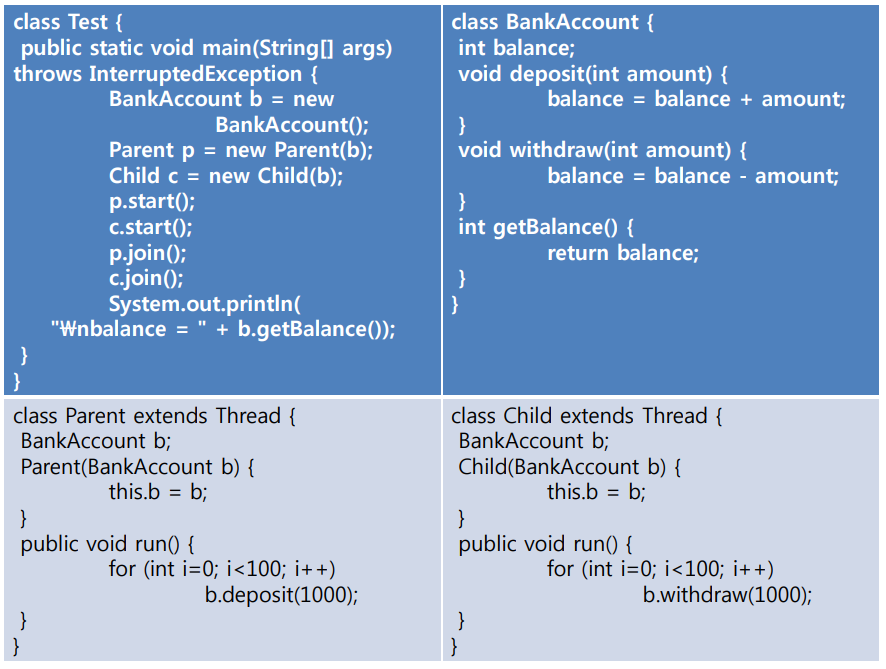 위 과정의 1번과 2번 사이 혹은 2번과 3번 사이 혹은 3번과 4번 사이에서 context switing이 발생하면 다른 스레드로 작업이 전환된다. 전환된 스레드가 balance를 보았을 때 아직 업데이트가 되지 않았으므로 전환된 새 스레드는 예전 값을 가지고 자신의 계산을 진행하게 된다. 이때 문제가 발생되는 것이다. 실제 동작으로 예시를 들면 잔액 0원인 계좌에 1000원을 입금하는 스레드와 1000원을 출금하는 스레드가 있다고 가정해 보자. 1000원을 입금하는 스레드가 먼저 동작하여 3번 작업을 하는 도중 context switcing이 일어난다. 이제는 출금하는 스레드가 동작하게 된다. 출금하는 스레드가 보았을 때 계좌의 잔액은 0원이다. 따라서 출금을 완료하면 계좌의 잔액은 -1000원이 된다. 이제 할 일을 다 했으므로 다시 입금하는 스레드로 context switing이 발생한다. 입금하는 스레드는 3번까지 한 일을 다시 가져와 동작을 하는데 본인이 가지고 있는 balance 값은 맨 처음 balance 값이므로 0원이다. 이 balance(0원)에 1000원을 더하면 1000원이 된다. 따라서 최종 계좌의 잔액은 1000원이 된다. 잔액이 0원인 계좌에 1000원을 입금/출금했는데 잔액이 1000원이 되는 이상한 상황이 발생했다. 이러한 문제가 발생하는 원인은 결국 계산의 과정 중 context switching이 일어났기 때문이다. 따라서 1~4의 작업은 중간에 끼어들지 못하는 atomic(원자, 더 이상 쪼갤 수 없는)한 작업이 되어야 하며 그렇게 된다면 문제가 해결될 것이다.