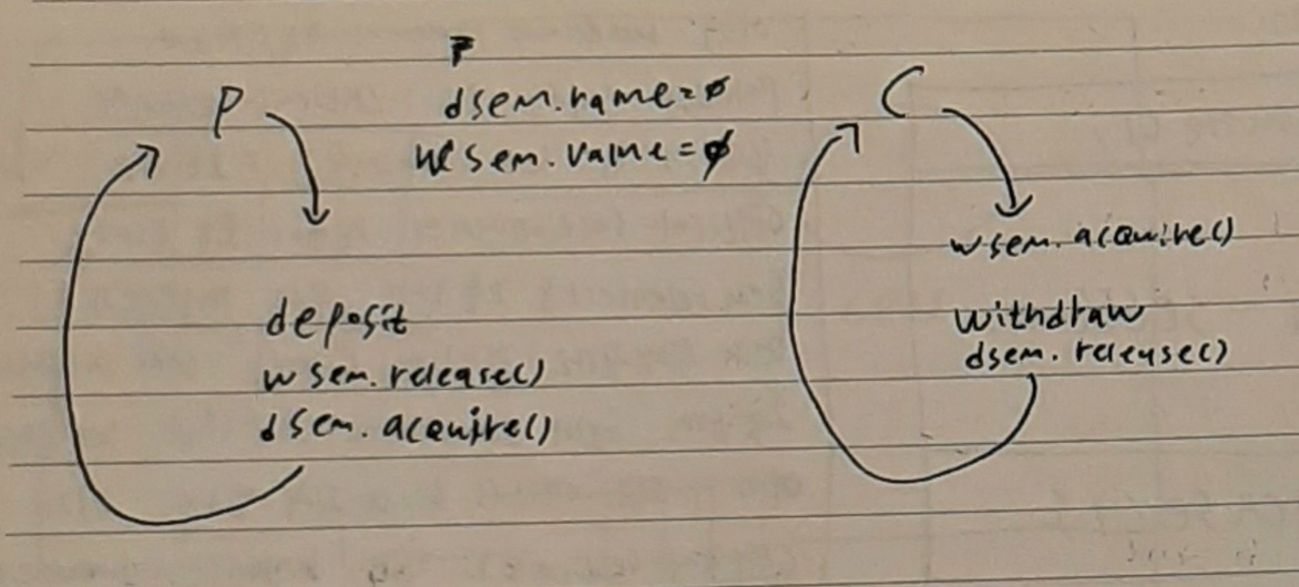 만약 p2를 먼저 실행하고 싶다면 저 둘의 acquire()와 release()를 만대로 두면 된다. 그렇다면 번갈아가며 실행하고 싶을 때는 어떻게 해야 할까?(P-C-P-C-P-C-......) 입출금이 교대로 나오게 하려면 입금 세마포어, 출금 세마포어 총 2개의 세마포어가 필요하다. 우선 두 세마포어의 value는 모두 0으로 만든다. parent thread는 deposit()을 한 뒤 withdraw_semaphore.release()와 deposit_semaphore.acquire()를 하도록 만들고 child thread는 withdraw_semaphore.acquire()를 한 뒤 withdraw()를 하고 deposit_semaphore.release()를 하도록 만든다. 이렇게 하면 무조건 입금 먼저 발생하며 번갈아가며 출금-입금-출금-,......이 반복될 것이다. 아래 그림을 참고하자.