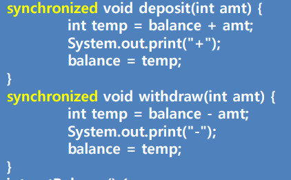 모니터를 사용하여 bacnkAccount problem을 풀어보자. 세마포어와 비교했을 때 정말 간단하다. 그냥 deposit() 함수와 withdraw() 함수 앞에 synchronized만 붙이면 된다. 다시 말해 synchronized로 critical-section을 감싸기만 하면 끝이다.