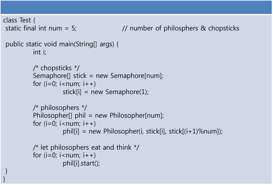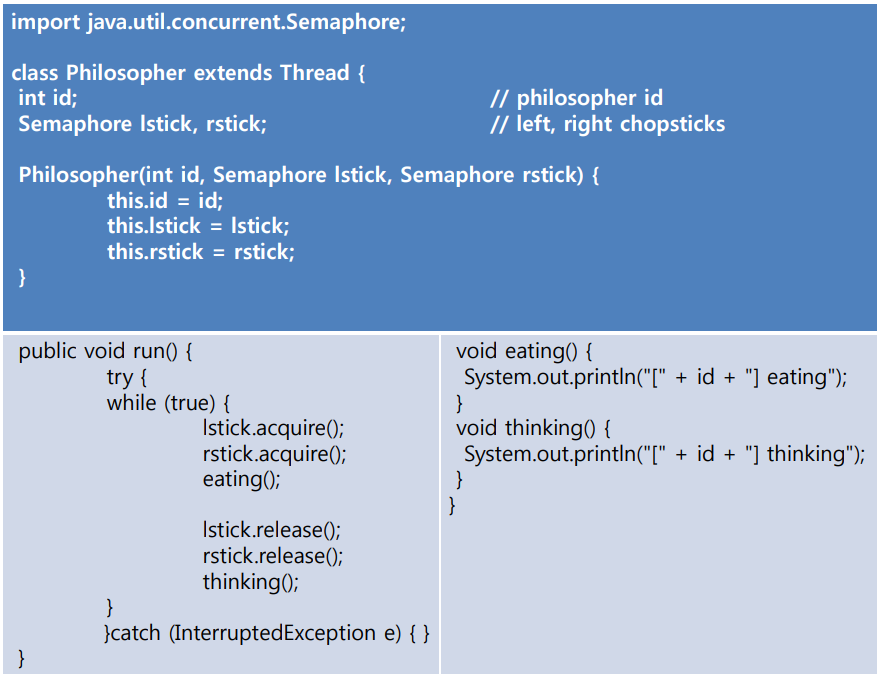 위 프로그램이 중간에 멈추는 이유는 교착 상태(Deadlock)가 발생하기 때문이다. 예를 들어 어느 순간 모든 철학자들이 동시에 자신의 왼쪽 젓가락을 집는다고 생각해 보자. 이제 모든 철학자들은 자기 오른쪽 젓가락이 사용 가능해질 때까지 기다릴 것이다. 그런데 모든 철학자들이 그러고 있으므로 모든 철학자가 영원히 2번 상태에 머물러있게 된다. 아무리 시간이 지나도 프로그램이 아무 진행도 되지 않는 것이다. 이러한 상황을 교착 상태(Deadlock)라 한다. 식사하는 철학자 문제는 아래에서 배울 환형 대기를 깸으로써 문제를 해결할 수 있다.
