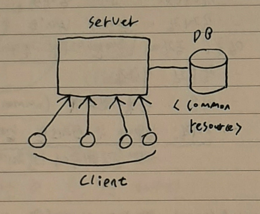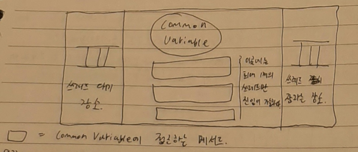 - 왼쪽 queue는 mutual exclusion이 되도록 하는 queue이다. 어떤 스레드가 위 그림 common variable 밑에 있는 네모에 접근하여 작업하고 있다면 다른 스레드는 네모에 들어가지 못하며 왼쪽 queue에서 대기해야 한다.