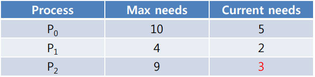 - 이러한 상황에서 순서대로 할당을 한다면 다음과 같다. p0, p1, p2 순서대로 5개 2개 3개를 할당한다. (12 - (5+2+3) = 2) 그다음 다시 p0의 차례인데 현재 마그네틱 테이프는 3개인데 요구량은 5개이므로 줄 수 없고, 다음으로 넘어간다. p1의 요구량은 2개이므로 2개를 할당하면 p1의 전체 요구량인 4를 만족시킨다. 따라서 p1은 4개를 다시 반납한다. (2 - 2 + 4 = 4) 이제 시스템이 갖고 있는 전체 마그네틱 테이프는 총 4개가 되었는데 p0의 최소 요구량은 채울 수 없고 p2에게 주어도 p2의 최대 요구량을 채울 수 없다. 따라서 p0, p2 누구의 needs도 만족시킬 수 없게 된다. 이러한 할당 방식을 불안전 할당이라 하며, p0, p2는 더 이상 프로세스가 진행될 수 없고 데드락에 빠지게 된다.