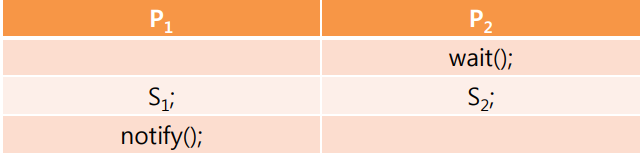 이번에는 모니터를 사용하여 입금/출금 순서가 고정되도록 오더링을 해보자. 입금 스레드가 먼저 동작하도록 하기 위해서는 parent thread(p1)와 child thread(p2)의 동작을 아래 그림과 같이 설정해 놓으면 된다.(s1과 s2는 critical-section을 뜻한다.) 세마포어는 오더링을 하기 위해 두 개의 세마포어가 필요했지만 모니터는 한 개로 동일한 기능을 구현할 수 있다.