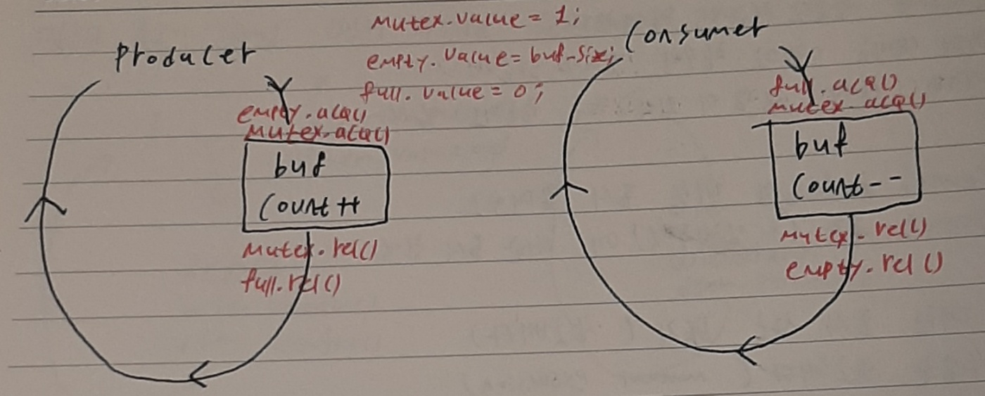위 코드가 count != 0 혹은 실행 불가인 이유는 공통 변수 count, buf[]에 대한 동시 업데이트 때문이다. 다시 말해 임계 구역에 대한 동시 접근 때문이다. 따라서 임계구역에 대한 동시 접근을 방지(상호 배타)하면 문제를 해결할 수 있다. (mutual exclusion을 해결하는 세마포어이므로 mutex라 이름 짓겠음) mutex의 value는 1로 설정한다. producer는 buf의 count를 ++하기 전 mutex.acquire()를 한다. 그리고 buf count ++을 하고 mutex.release()를 한다. consumer도 마찬가지로 buf count --하기 전 mutex.acquire()를 하고 buf count --를 한 뒤 mutex.release()를 한다. 이렇게 하면 critical section에는 하나의 thread만 들어가므로 문제가 해결된다.