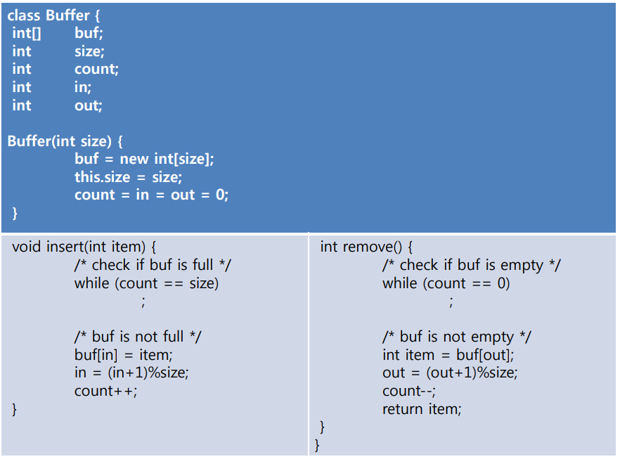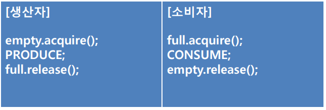 위 유한 버퍼 문제에서 생산자는 버퍼가 가득 차면 기다려야 하고, 소비자는 버퍼가 비어있으면 기다려야 한다. 위 코드에서 기다리는 코드를 while(count == ?)로 했는데 이렇게 작성하면 CPU는 기다리는 동안 다른 일을 하지 못하고 공연히 while문만 계속 반복하게 된다. 이는 성능적인 측면에서 비효율적이며 CPU 자원 낭비다. 이는 empty와 full 이 두 개의 세마포어를 추가로 사용하여 해결할 수 있다. empty 세마포어의 value는 buf_size로 설정하고 full 세마포어의 value는 0으로 설정한다. 생산자는 생산하기 전 empty.acquire()를 호출하여 만약 buf가 꽉 차 있다면 스스로를 block 하도록 한다. 그리고 생산 코드 뒤에는 full.release()를 호출한다. 소비자는 소비하기 전 full.acquire()를 호출하여 만약 buf가 비어있다면 스스로를 block 하도록 한다. 그리고 소비 코드 뒤에는 empty.release()를 호출한다.