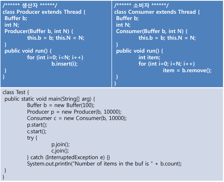 아래 코드를 실행하면 잘못된 결과가 발생한다. 최종적으로 버퍼 내에는 0개의 항목이 있어야 하는데 count != 0 이거나 아예 실행이 되지 않는 컴퓨터도 있다.