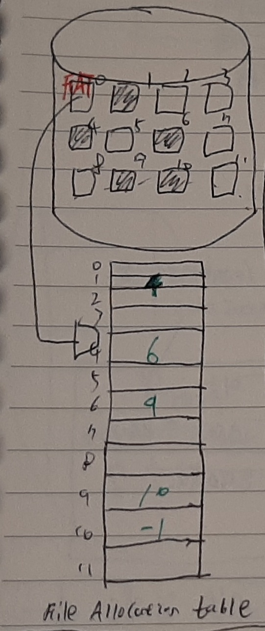 - 5kb의 file을 FAT를 사용하여 저장하면 아래와 같은 그림이 된다. 각 블락에 포인터를 만들지 않아도 file allocation table에 해당 정보가 적혀있으므로 문제없이 작동한다. 각 블록들을 순차적으로 읽지 않고 FAT만 보고 바로 원하는 블록으로 이동할 수 있으므로 direct access가 가능해진다.(테이블은 메모리에 올라가 있을 테니 헤더가 직접 움직이는 Linked allocation과는 다르다.) 또, 일부 sector가 Bad sector가 되더라도 FAT만 잘 살아있다면 문제없이 다음 sector를 지정할 수 있다. 물론 FAT이 날라가면 이런 작동이 불가능하므로 이중 저장(백업)을 한다. FAT16의 경우 2^16개의 포인터를 저장할 수 있고 FAT32의 경우 2^32개의 포인터를 저장할 수 있다.