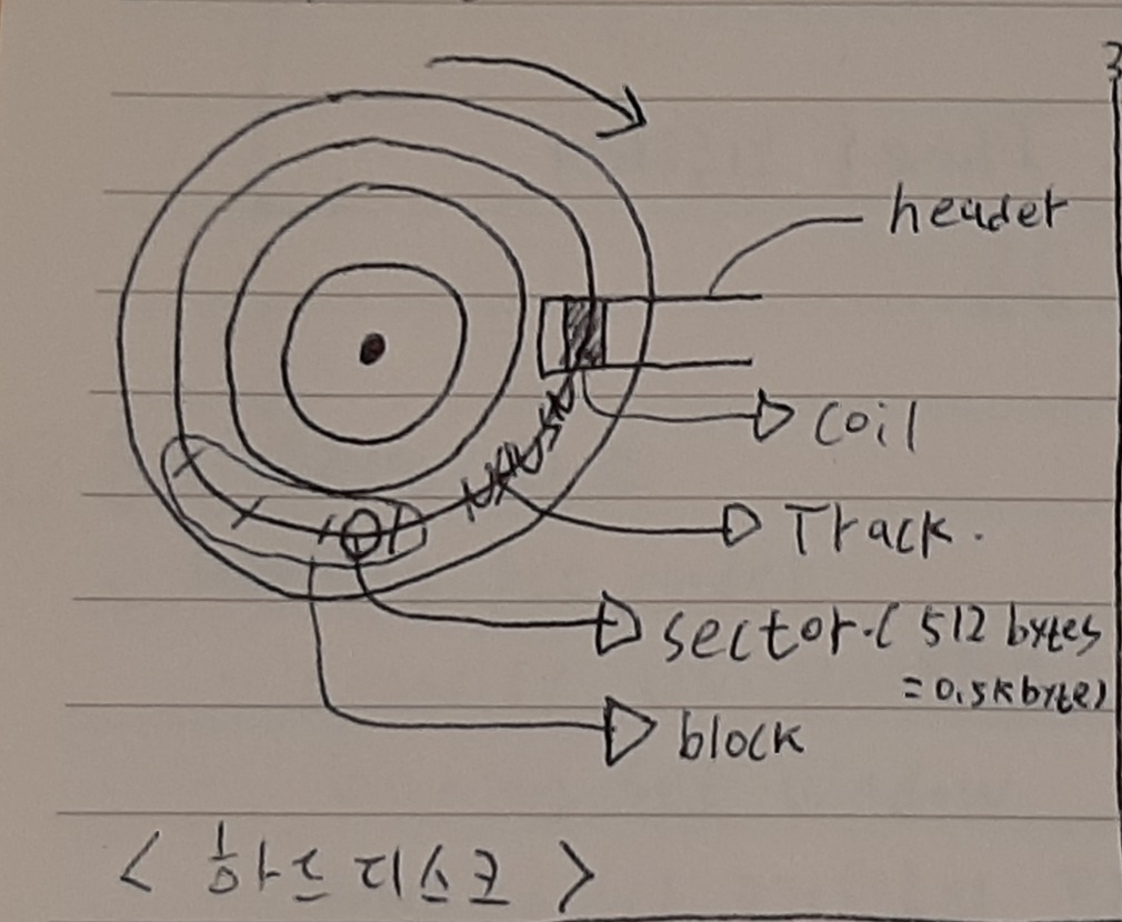 ** 하드디스크는 아래 그림과 같이 이루어져 있으며 데이터를 기입할 때는 코일에 전기 신호를 줘서 track의 sector에 N, S극을 저장하고 읽을 때에는 판을 회전시켜 N극 혹은 S극이 coil 밑을 지날 때 coil에 전기 신호를 일으키는 방식으로 읽는다. 이때 sector 들의 집합을 block이라 하며 하드디스크는 이 block 단위로 읽기/쓰기를 한다. 그래서 하드디스크를 block device라고도 한다. 참고로 block device의 반대는 character device이며 keyboard가 이에 해당된다.(글자 단위로 읽기/쓰기) 어쨌든 블록 디바이스인 하드디스크는 우리가 메모장에 'a'라는 단 한 글자를 적고 저장을 하더라도 한 블록 단위로 저장을 하기 때문에 1byte가 아닌 4byte로 저장이 된다. 이 블록의 크기가 크면 header를 조금 움직여도 한 번에 많이 읽어오니까 속도가 빠르지만 위 예시처럼 용량 낭비가 일어날 수 있고 반대로 블록 크기를 작게 설정하면 용량 낭비는 적지만 같은 양을 읽더라도 header를 자주 움직여야 하니까 속도가 느리다.(tradeoff가 있음)